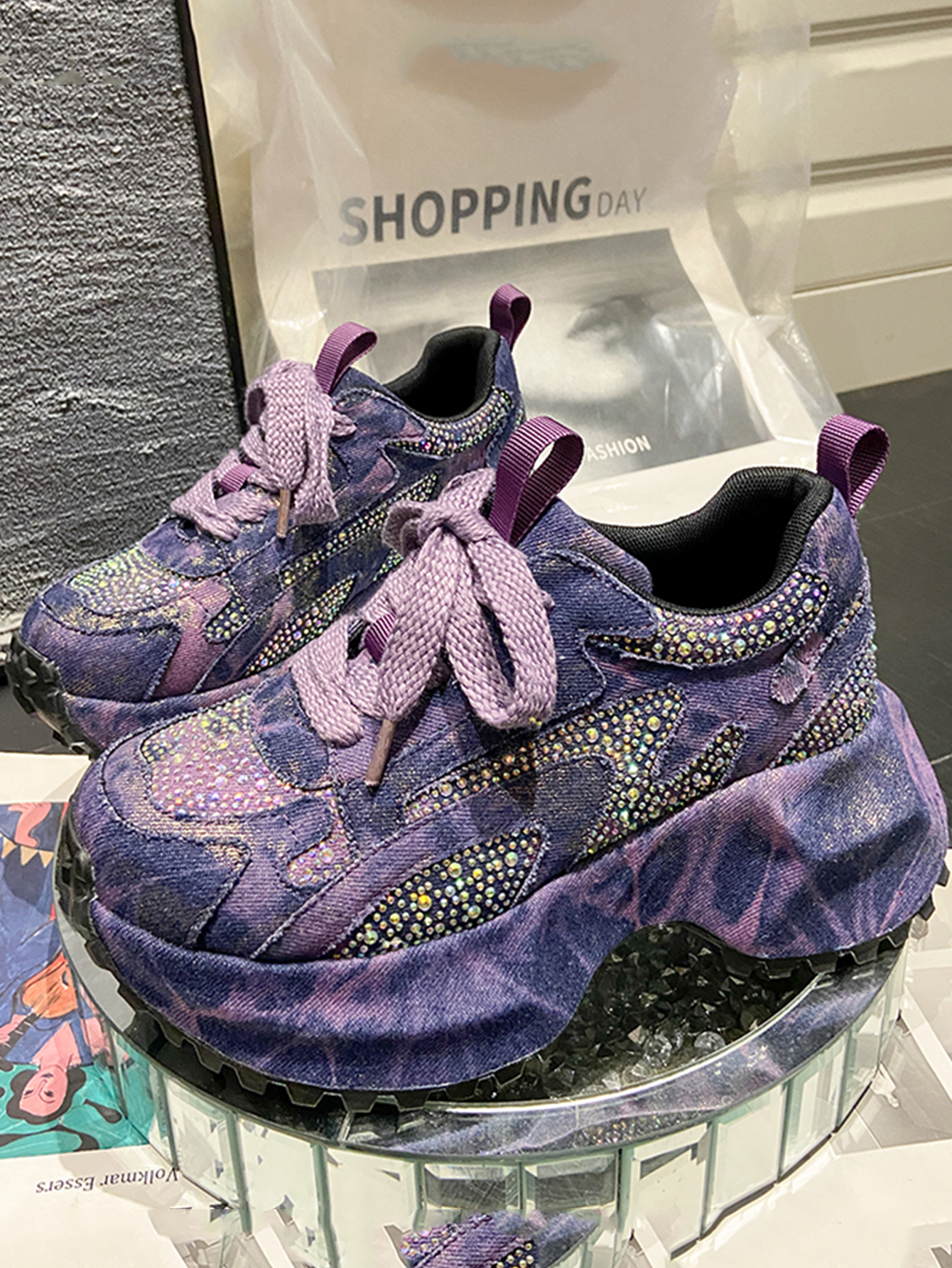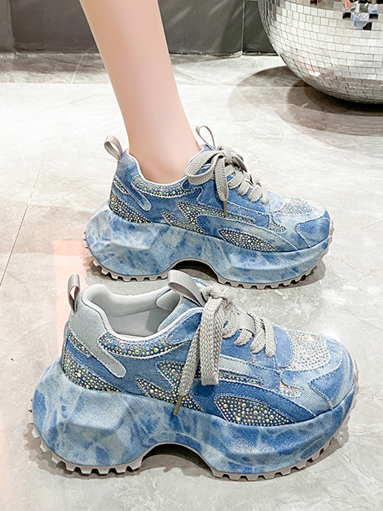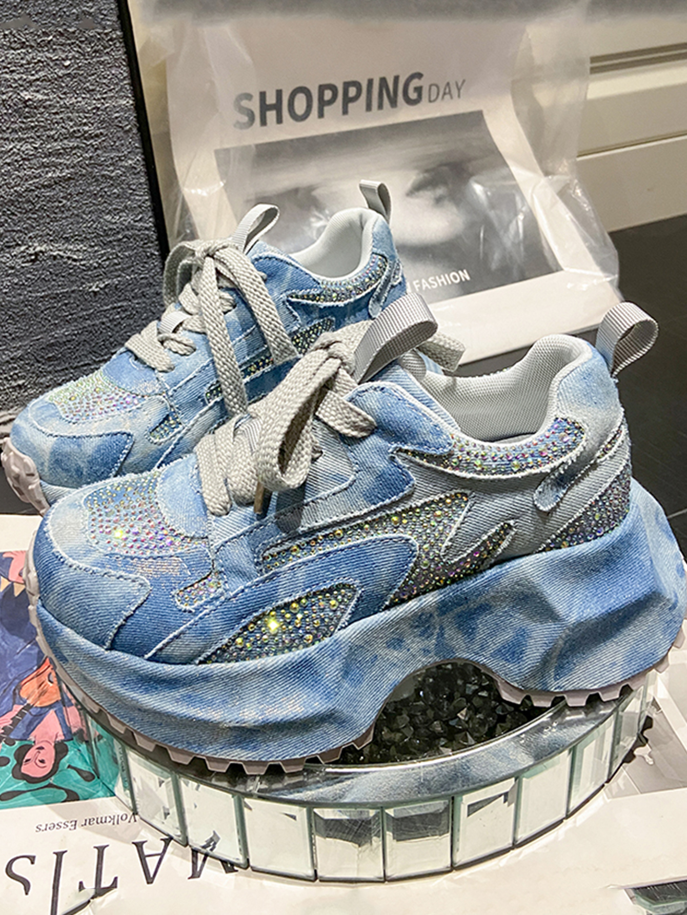 Sparkling Denim Sneakers For Women, Blue White Gradient High Top Platform Shoes With Rhinestones, Unique Fashion Thick Sole Design For Comfort