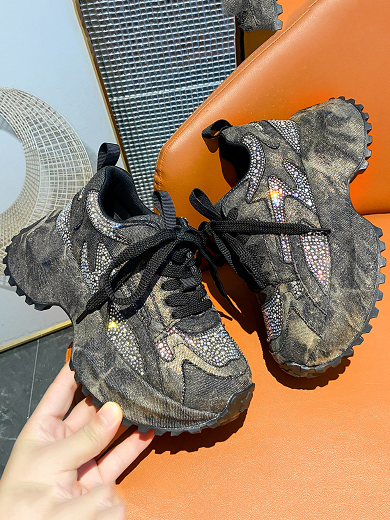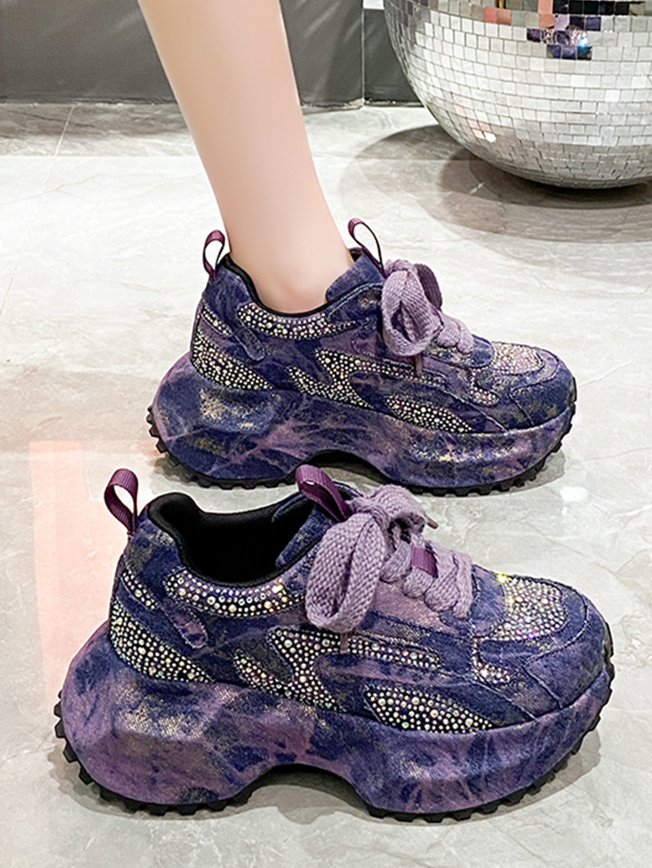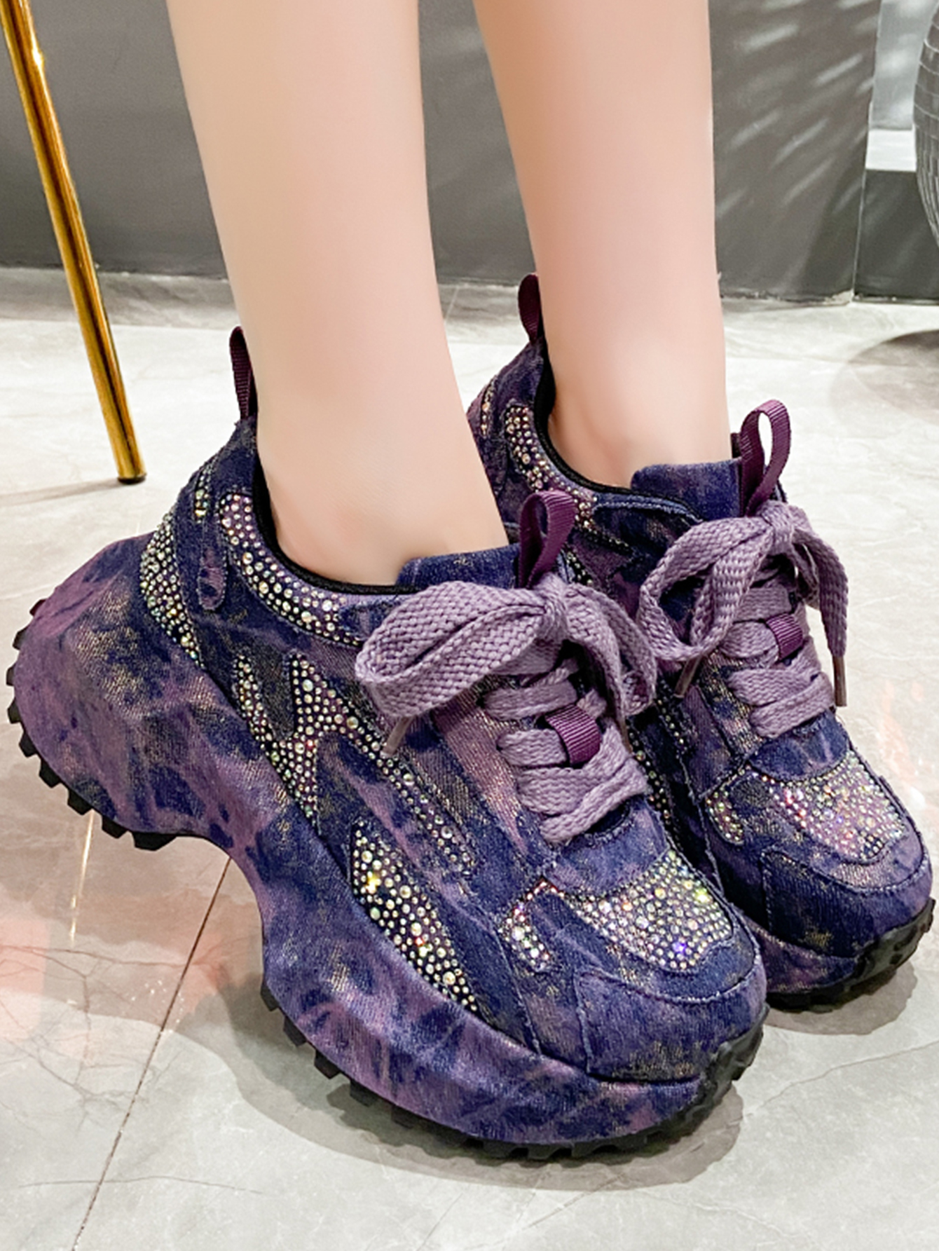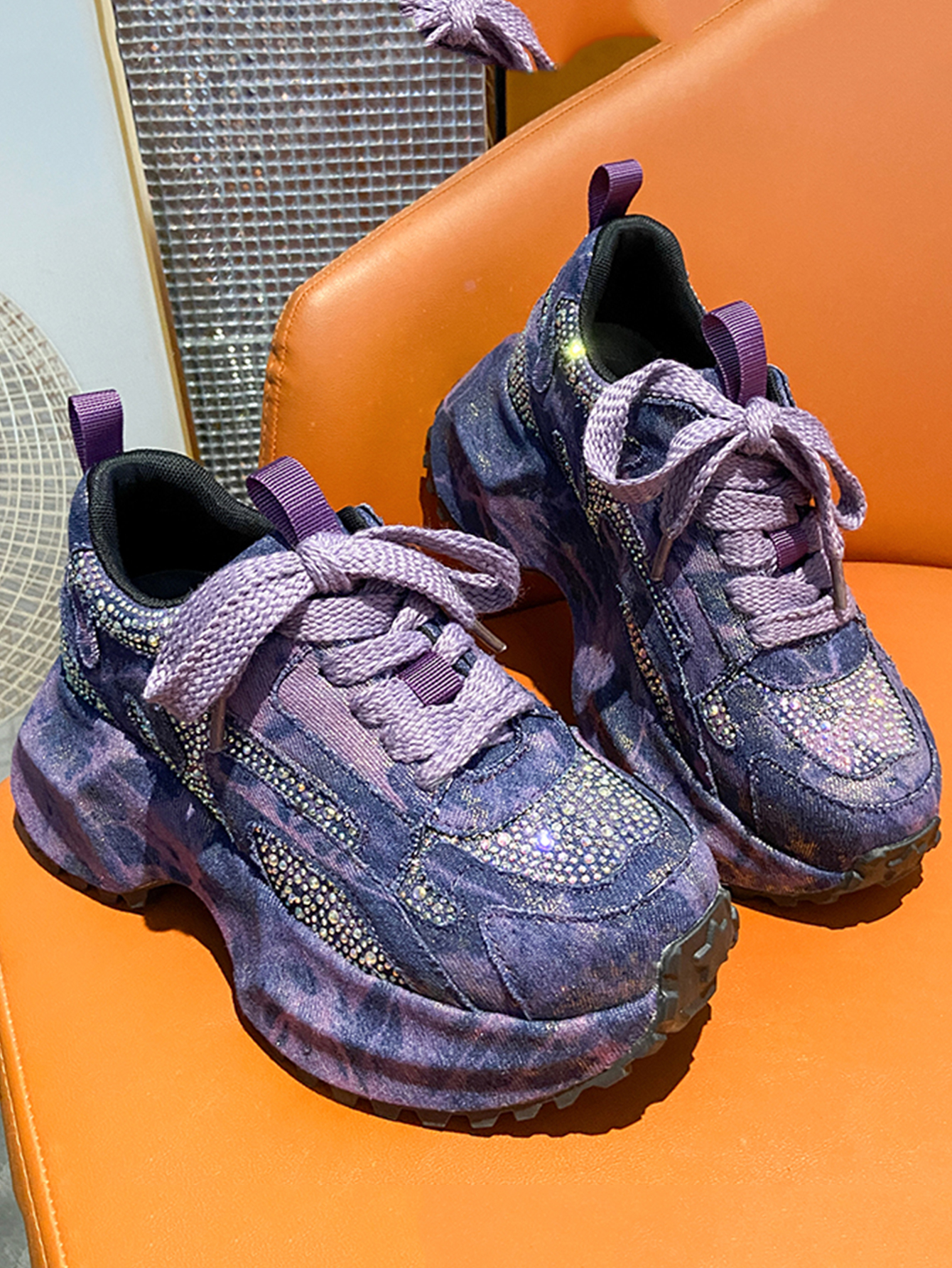 Sparkling Denim Sneakers For Women, Blue White Gradient High Top Platform Shoes With Rhinestones, Unique Fashion Thick Sole Design For Comfort
